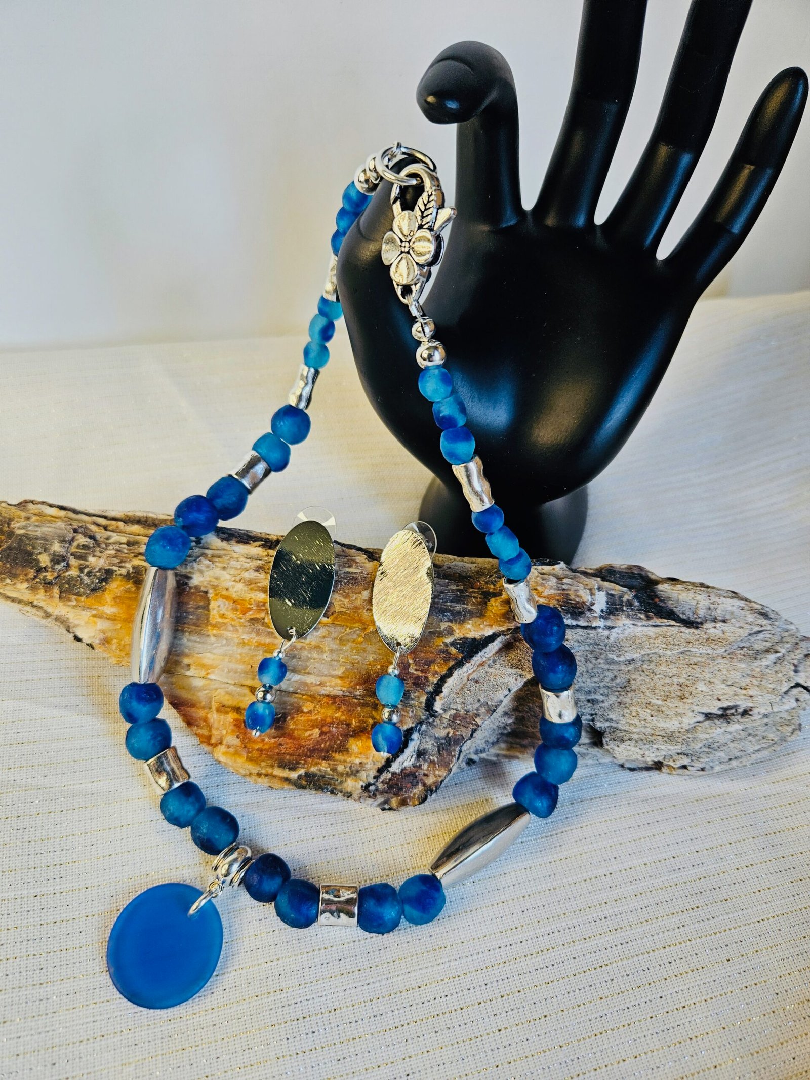 18″ necklace and earrings and 1″ pendant in aqua swirl glass from Ghana, Africa and stainless steel accents.